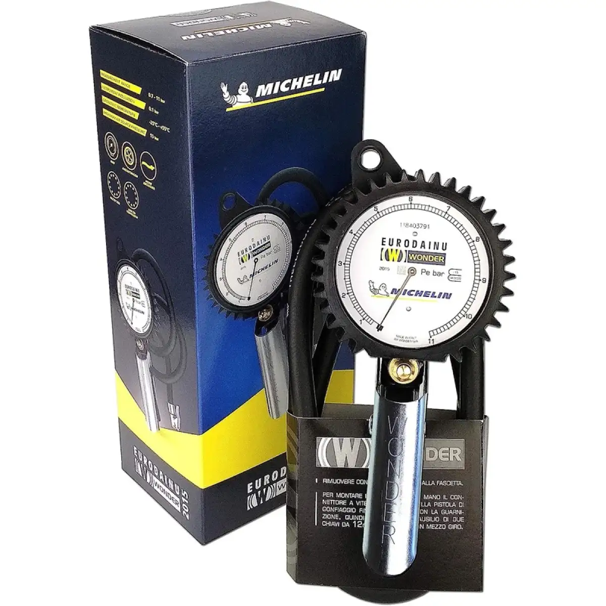 Manometro (Quadrante):Un quadrante circolare con scale di misurazione chiare. Le unità di misura indicate sono Bar (con una scala da 0 a 12 Bar) e Psi (con una scala corrispondente, che arriva a circa 170-175 Psi).