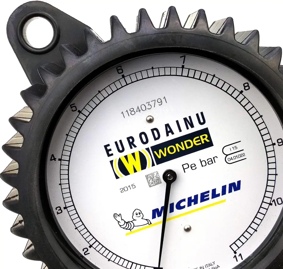 Manometro (Quadrante):Un quadrante circolare con scale di misurazione chiare. Le unità di misura indicate sono Bar (con una scala da 0 a 12 Bar) e Psi (con una scala corrispondente, che arriva a circa 170-175 Psi).