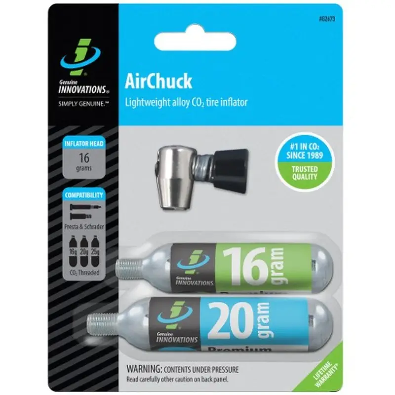 AirChuck di Genuine Innovations è uno dei gonfiatori CO2 più apprezzati sul mercato per velocità, leggerezza e praticità. Progettato per offrire un gonfiaggio rapido e senza dispersioni, utilizza l’innovativa tecnologia push-to-inflate che permette un controllo totale del flusso di CO2.
